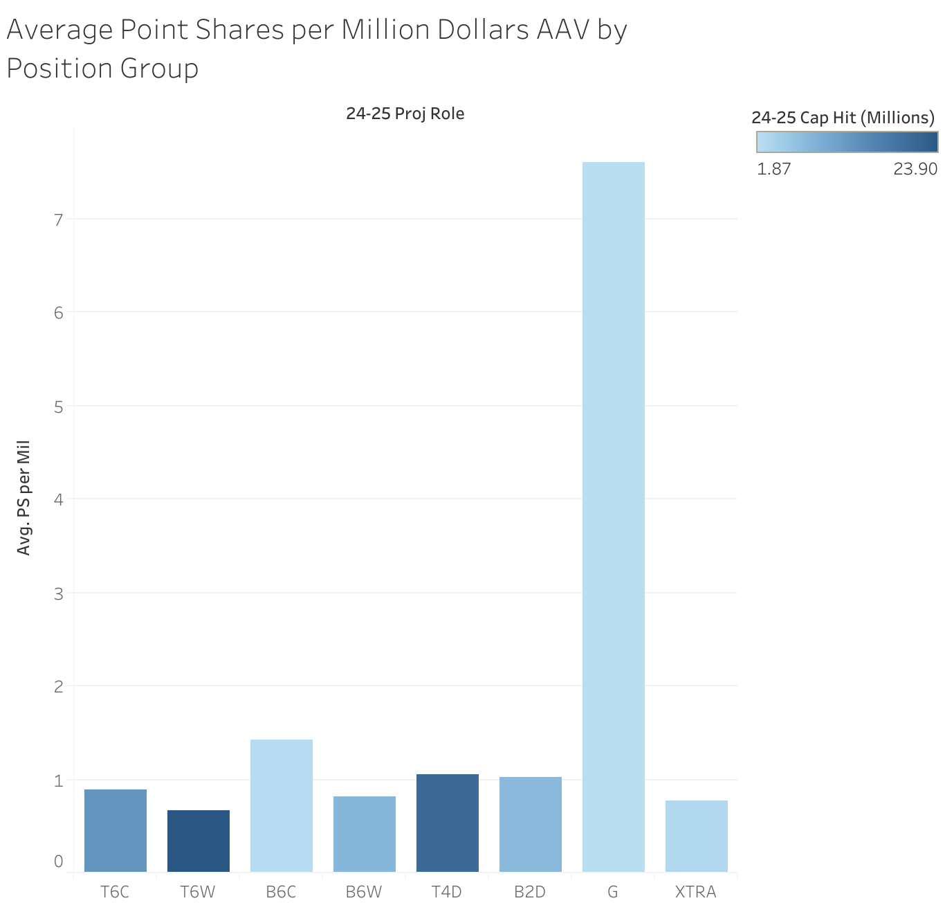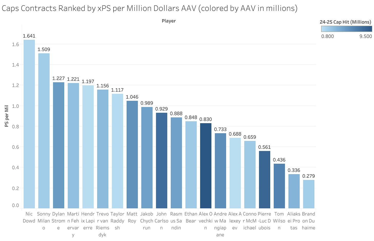 Ok, time for the big reveal. Here’s every Caps contract ranked by his 24-25 expected point share contribution per million dollars in 24-25 cap hit. The chart is colored by the AAV of the contract—darker blues signify more expensive contracts.